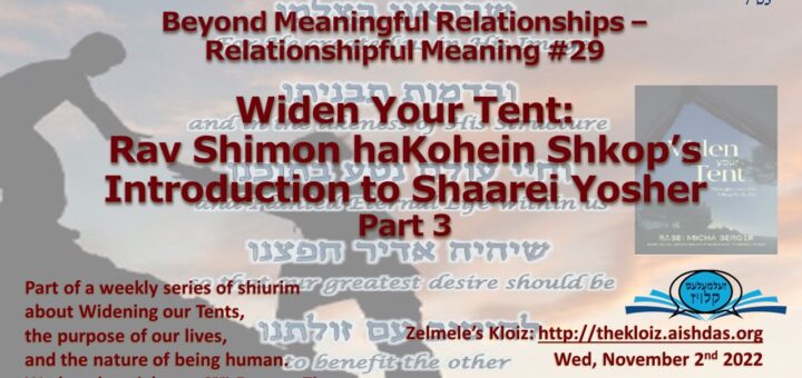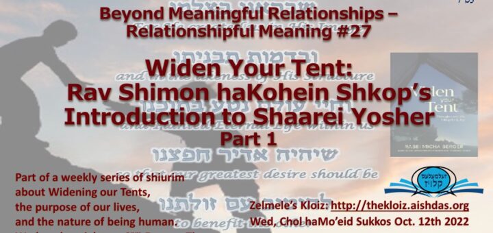 On Wednesday Chol haMo’eid Sukkos (October 12th) at 8pm, started our discussion of the introduction to Shaarei Yosher, by Rav Shimon Shkop. This is the last text in the Beyond Meaningful Relationship – Relationshipful Meaning chaburah,