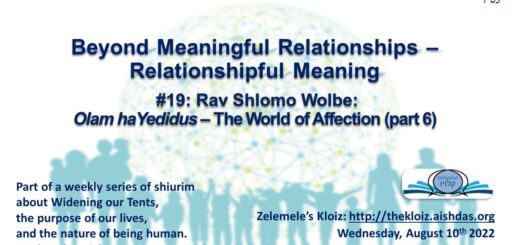 Another point discussed at more length: How does the first sentence and paragraph of Shema constitute qabbalas ol malkhus Shamayim (accepting the kingship of [the One in] Heaven) when there is no mention of the word Melekh in them? We looked at Rav Hutner’s take on the contrast between qabbalas ol malkhus Shamayim on Rosh haShanah, one of the days of yir’ah (awe/fear) and Shema which speaks in terms of ahavah, and the meaning of accepting Hashem as King.